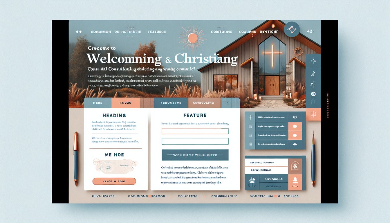 A modern and inviting Christian consulting website layout, featuring a header with a logo, navigation links, a hero section with an inspirational image and a call to action, sections for features, a form for visitor data, and a social media links section with friendly text inviting users to connect. The overall design should be warm and welcoming, with soft colors and clear typography.