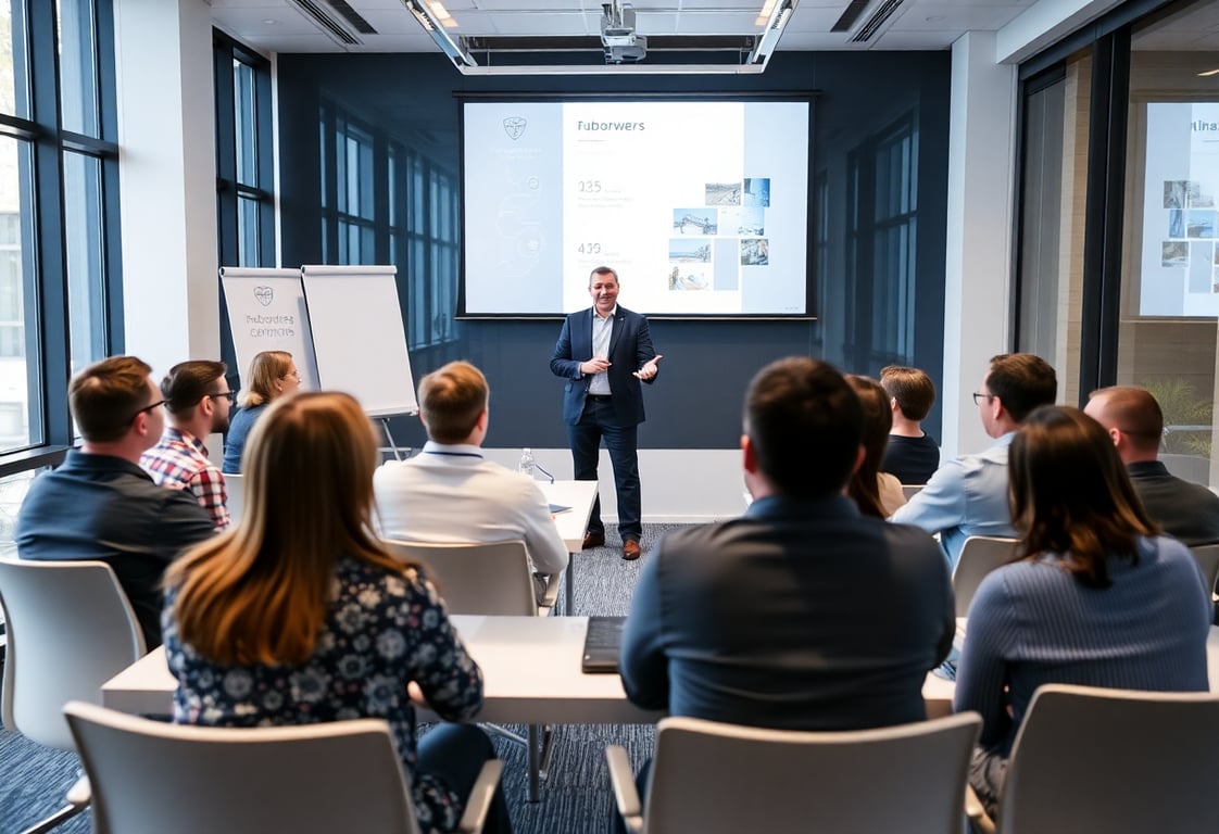 a trainer presenting to a group in a modern conference room
