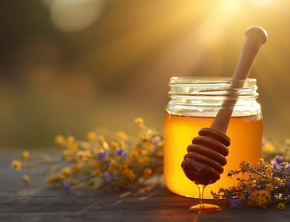 Raw Local Honey Jar with Wooden Dipper and Wildflowers
