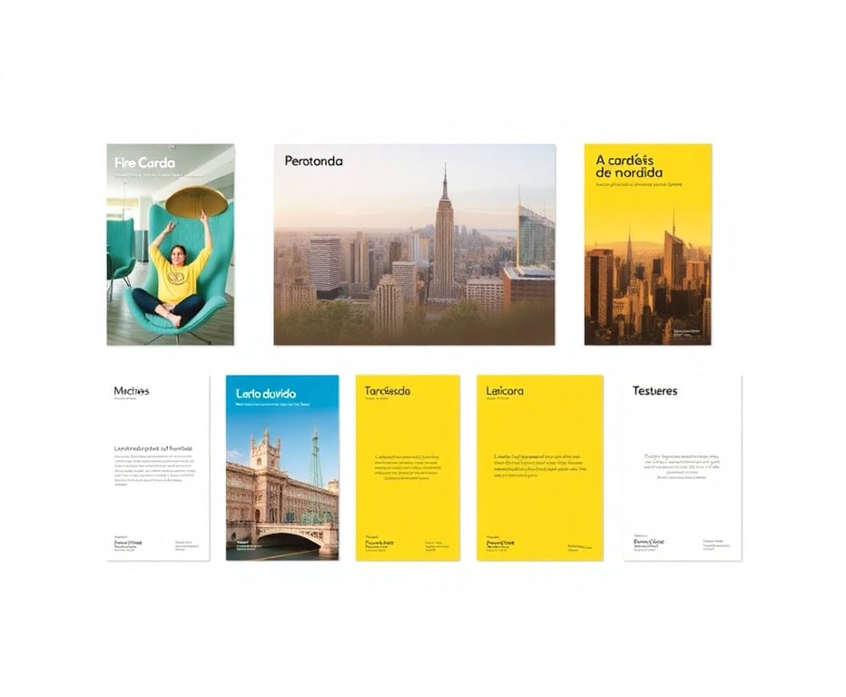 amostra de materiais impressos incluindo brochuras, cartões de visita e pôsteres