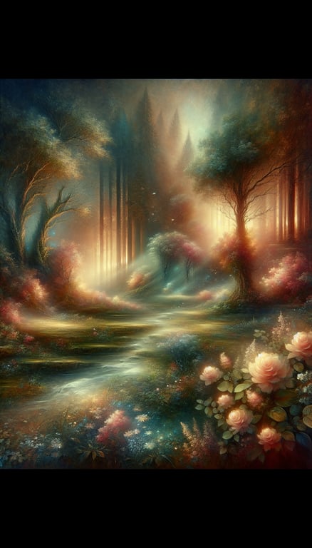 An enchanting scene featuring a mystical forest with delicate details, soft lighting, and ethereal elements like glowing flowers and gentle mist. The atmosphere should evoke a sense of wonder and fantasy, reminiscent of renaissance art styles. Include elements that suggest elegance and a dreamlike quality.