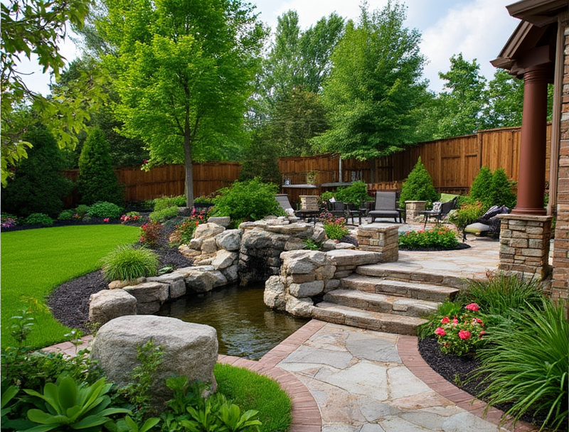 Beautiful landscaped backyard with stone features, water elements, and lush greenery creating a tranquil outdoor retreat