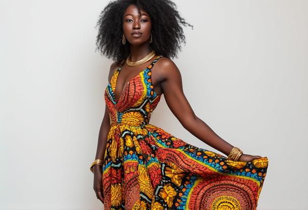 Beautiful model wearing colorful African print dress with gold accessories against white background