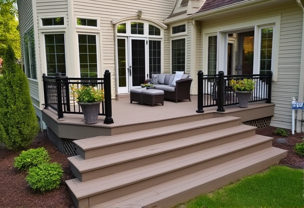 Beautiful wooden deck construction with modern railings and comfortable outdoor living space with furniture and planters