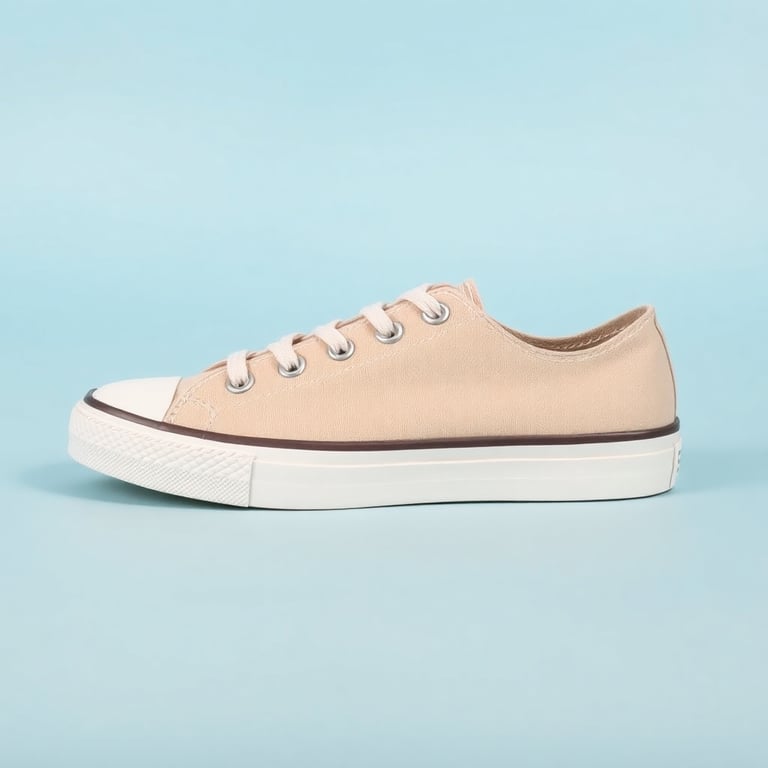 beige canvas sneakers on light blue background