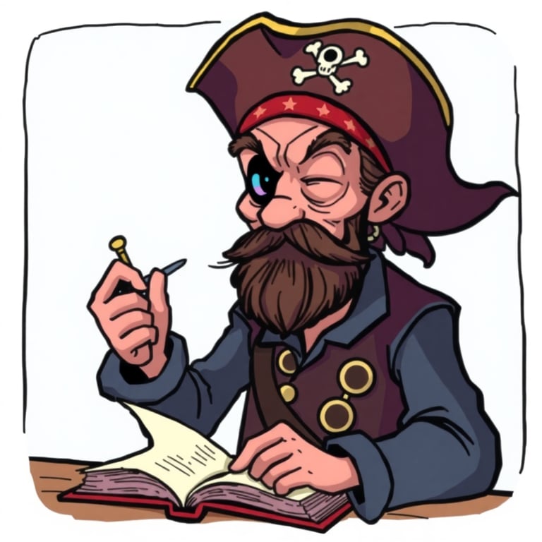 bucaneiro de conteúdo, escritor da pirate crew, usando um tapa-olho e segurando uma pena e pergaminho