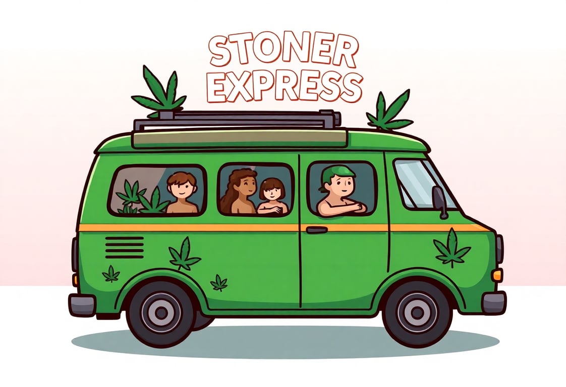 cartoon style image of a green van with people and cannabis leaves, representing the stoner express discord server