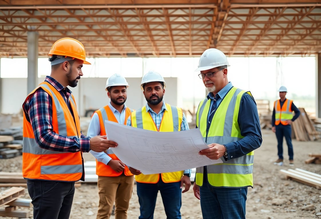 construction site with workers and manager reviewing plans, representing niqs's project management services