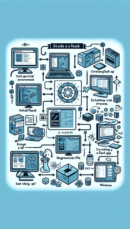Create a clean and organized guide for setting up a Flask environment on Windows, including steps for creating a virtual environment, installing Flask, creating a requirements file, running a Flask app, and accessing it in a browser.
