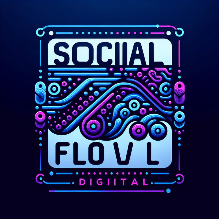 "Create a sleek and modern logo for 'Social Flow Digital,' a cutting-edge digital marketing company. The design should reflect creativity, connectivity, and motion. Incorporate flowing, dynamic elements like wave patterns, fluid lines, or interconnected dots to symbolize 'flow' and digital communication. Use a stylish, clean font, with emphasis on the word 'Flow' to give it a standout effect. The color palette should combine vibrant tones like electric blue, bright purple, and neon pink to convey energy, innovation, and a futuristic vibe. The logo should feel professional yet approachable, appealing to businesses seeking innovative marketing strategies."