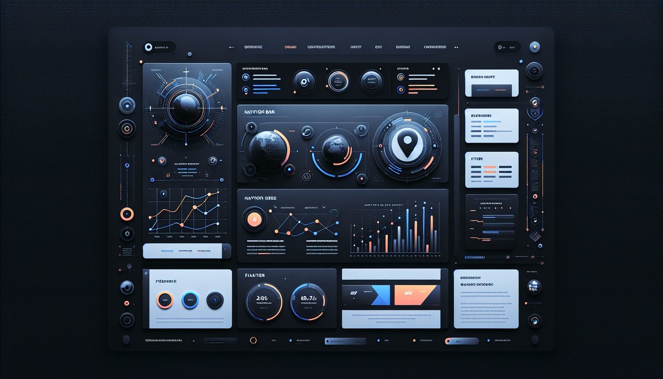 Create a website layout similar to the provided image, featuring a dark theme with sections for a navigation bar, header, filters, and multiple charts. The design should include a prominent title, a logo, and a background image that resembles the one in the specified link. Use modern web design elements and ensure the layout is clean and user-friendly.