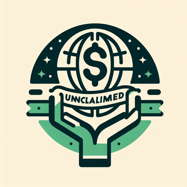 Dollar symbol in circle of world being held by hand with I in word unclaimed using question mark using colors green like cash simple and modern for logo