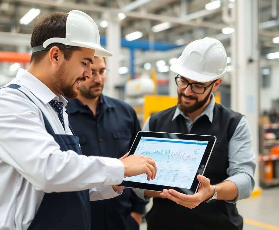 due professionisti che analizzano dati tecnici su un tablet in un ambiente industriale moderno