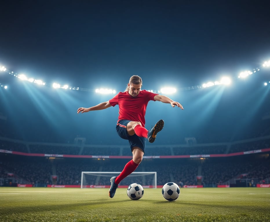 "football player kicking ball in a professional stadium with dramatic lighting"