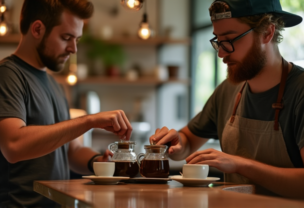 Fundadores da cafeteria Grão Dourado preparando café em um ambiente rústico e acolhedor