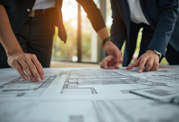 Hotel development professionals reviewing architectural plans and 3D models of a luxury resort project