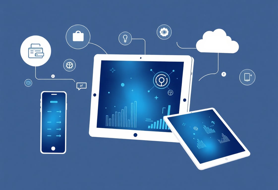 ilustração de dispositivos móveis e tablet mostrando soluções digitais inteligentes para negócios