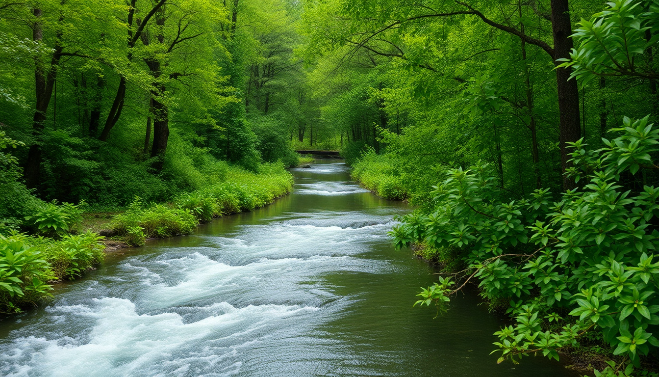 imagen de un hermoso arroyo fluyendo a través de un exuberante bosque verde, representando la optimización de cadenas de suministro agrícola