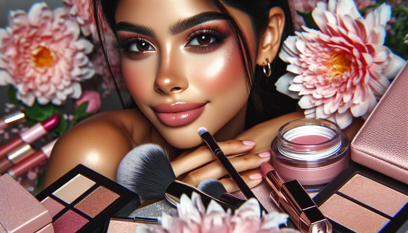 Joven modelo con maquillaje suave y radiante, rodeada de productos de maquillaje cute y flores rosadas