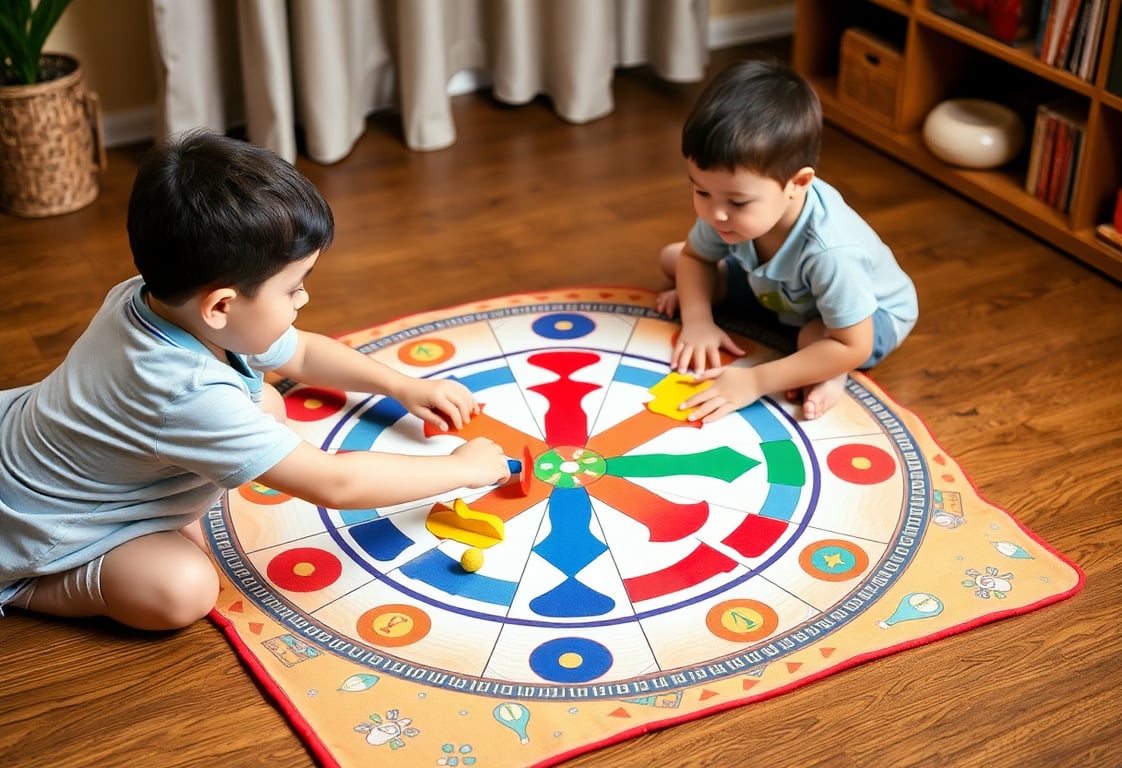 kids playing on a colorful ludo board game mat, showcasing the product's fun and interactive nature