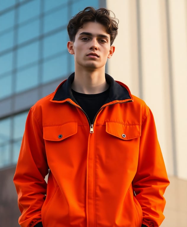 model wearing an orange zip-up jacket from paddock project's urban collection
