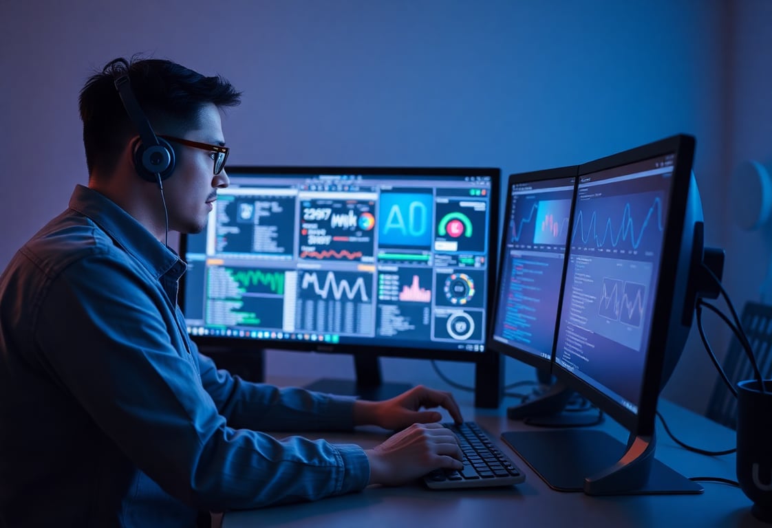 tech professional working on computer with modern interface designs and communication tools